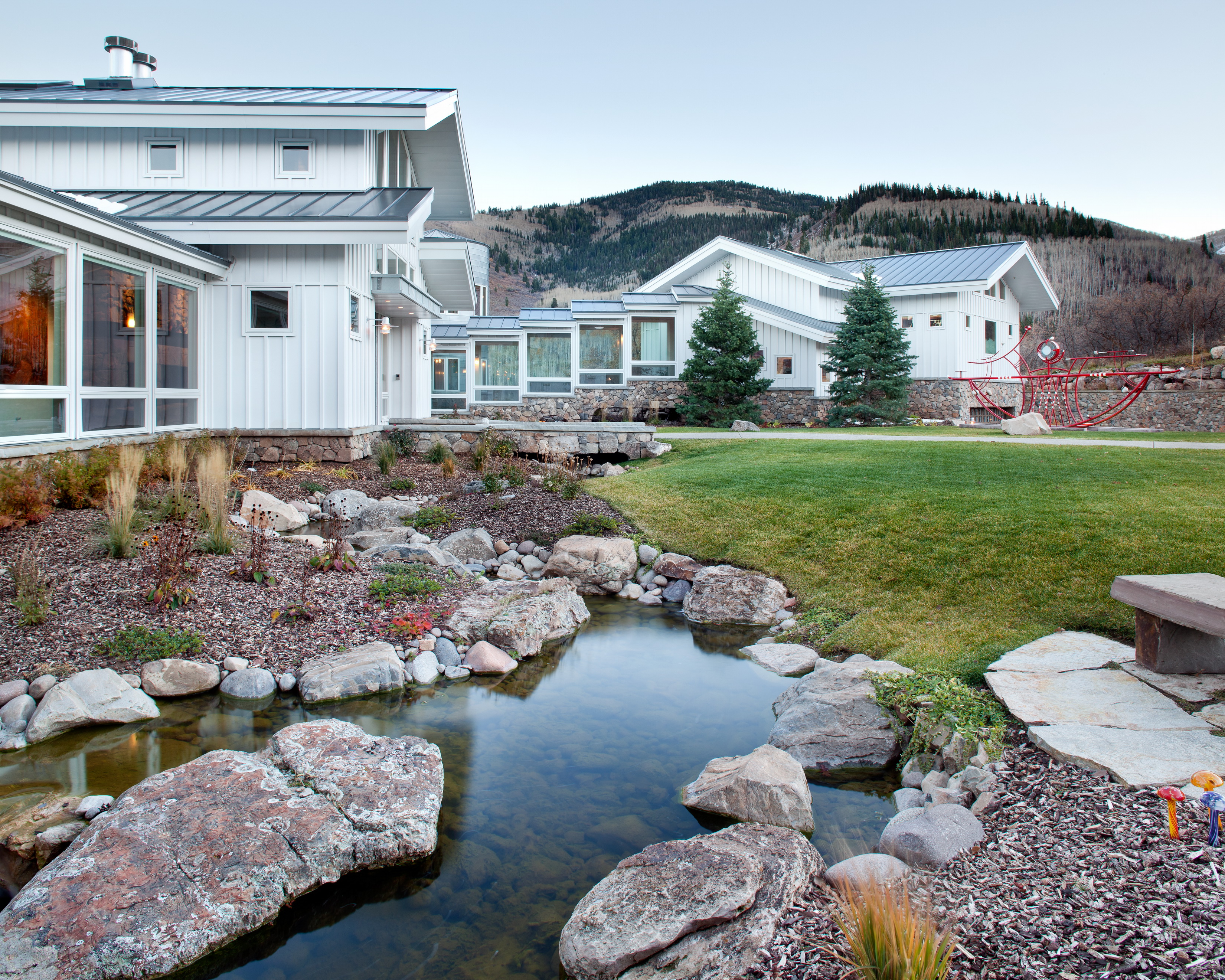 designed by Jack Thomas Associates, offers a striking blend of modern mountain architecture and bold artistic expression. Photographing it was about balancing the clean white volumes, stone details, and crisp rooflines with the dramatic Utah landscape, while also capturing the playful dialogue between the house and its sculptural centerpiece. The result is a visual narrative that highlights both the home’s architectural precision and its unique character within its alpine setting.